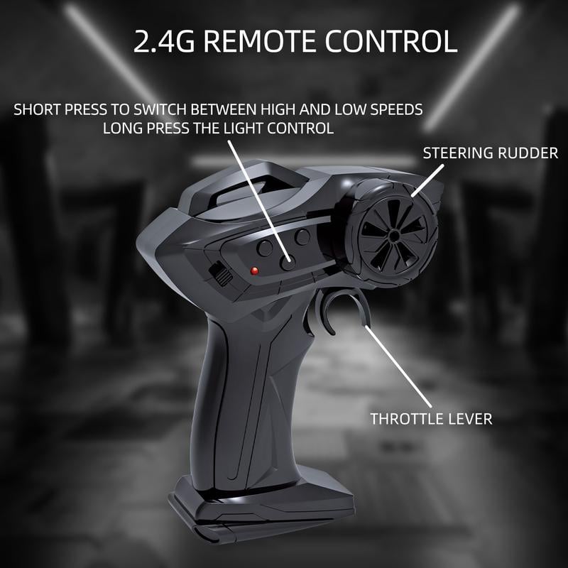 Pilot zdalnego sterowania 2.4G: Dołączony pilot zdalnego sterowania 2.4GHz zawiera drążek przepustnicy do przyspieszania, przycisk do sterowania światłami LED oraz elementy sterujące kierownicą, co zapewnia pełną kontrolę nad samochodem.