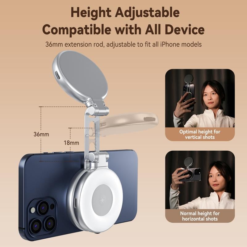 Uniwersalna kompatybilność: Nasza magnetyczna lampa do selfie nie tylko jest bezpośrednio kompatybilna z iPhone'ami z gniazdem MagSafe, ale działa również z dowolnym urządzeniem (w tym telefonami z systemem Android, laptopami, magnetycznymi statywami do selfie i wieloma innymi) po zastosowaniu dołączonego metalowego pierścienia samoprzylepnego.
