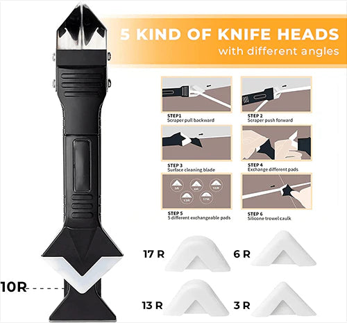 Zestaw Simple Sealing Tool Kit został sprytnie zaprojektowany, aby połączyć 3 praktyczne narzędzia do uszczelniania w jednym - może być używany jako skrobak do resztek silikonu lub jako ostre ostrze.